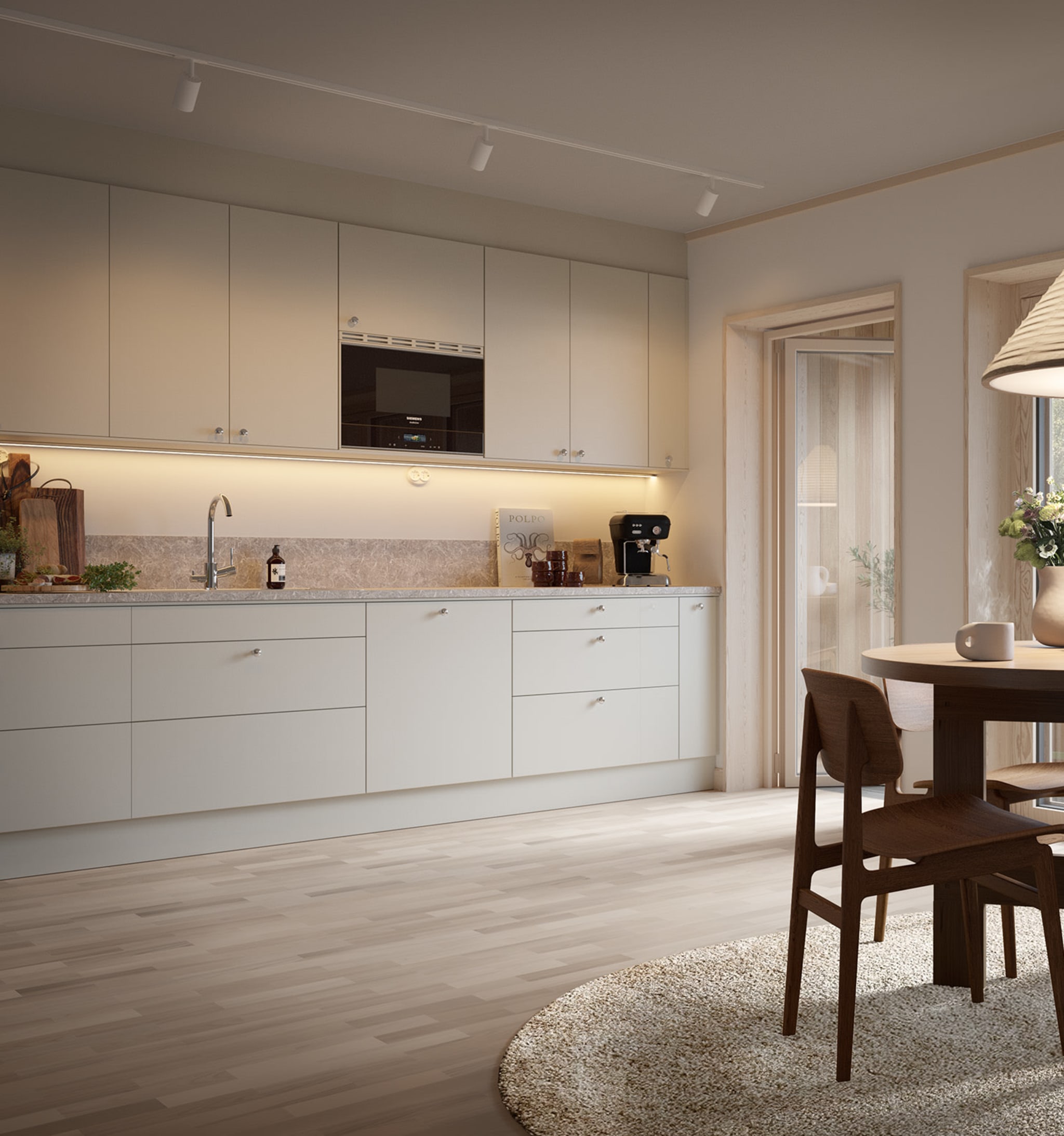 Med Vårt val får du en genomgående och sammanhållen mjuk känsla med varma, beigea toner tillsammans med inslag av trä som skapar en lugn och ljus harmoni i sin basnaturkänsla. I köket får du luckor i linnebeige och en exklusiv bänkskiva i kvartskomposit med planlimmad ho, samt stänkskydd som uppvik i samma kvartskomposit som bänkskivan. Köken utrustas med induktionshäll, inbyggd mikrovågsugn och diskmaskinen är dold bakom en snickerilucka.