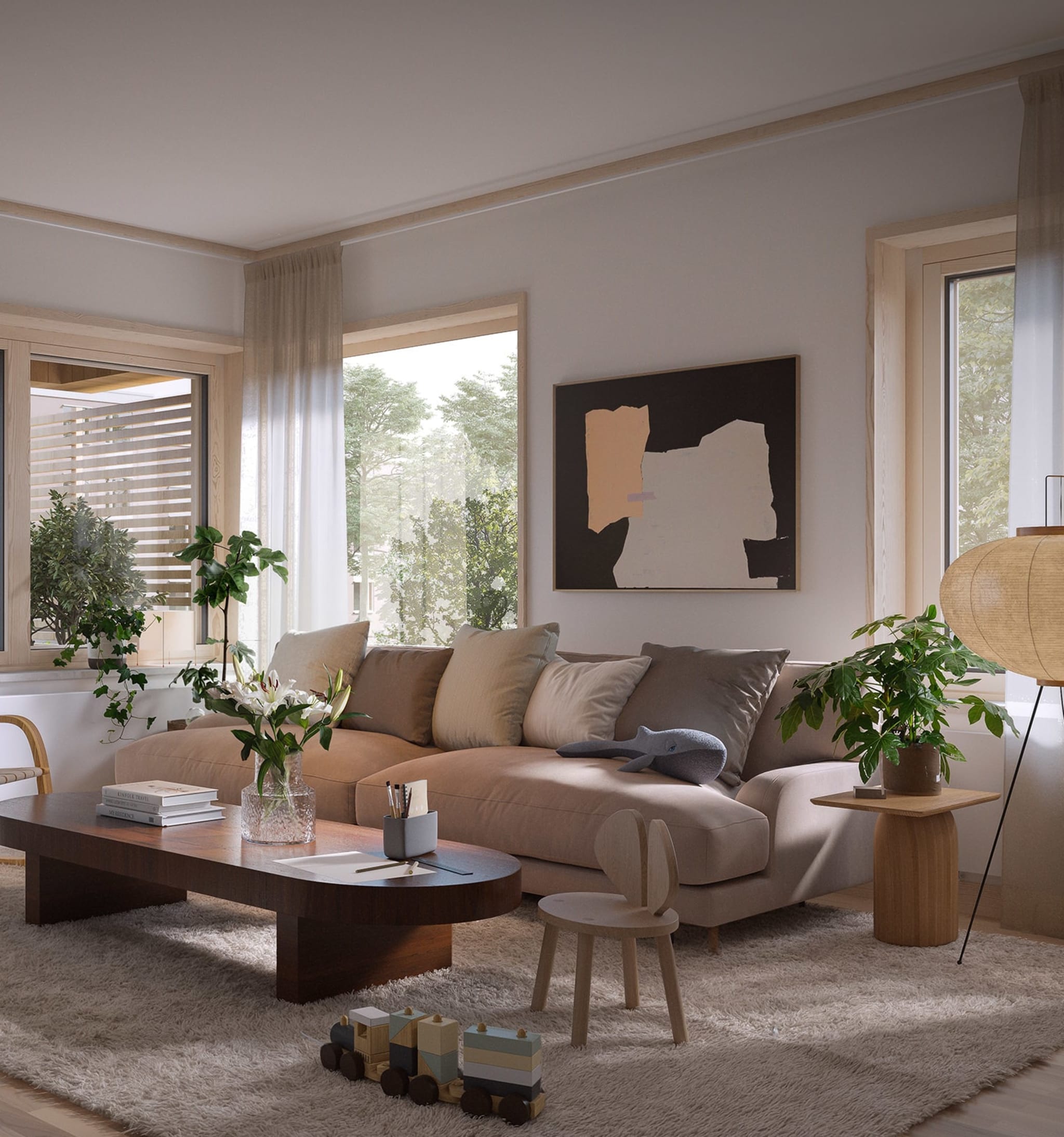 Bostäderna har en känsla och omsorg för detaljer. Att få bo i ett hus byggt med naturmaterial påverkar hur du mår och din livskvalitet.