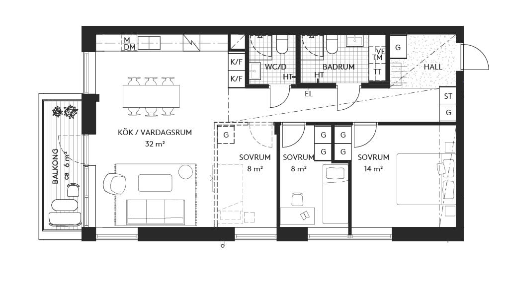 På 86 kvm ryms tre välplanerade sovrum ett med frånvalsvägg och två helkaklade badrum, varav ett med tvättmaskin och torktumlare. Ni har gott om förvaringsmöjligheter både i lägenheten och i ett tillhörande förråd på källarplan. Här bor du nära skog och stad, precis intill Nackareservatet och bara en kort promenad från Bagarmossens centrum.