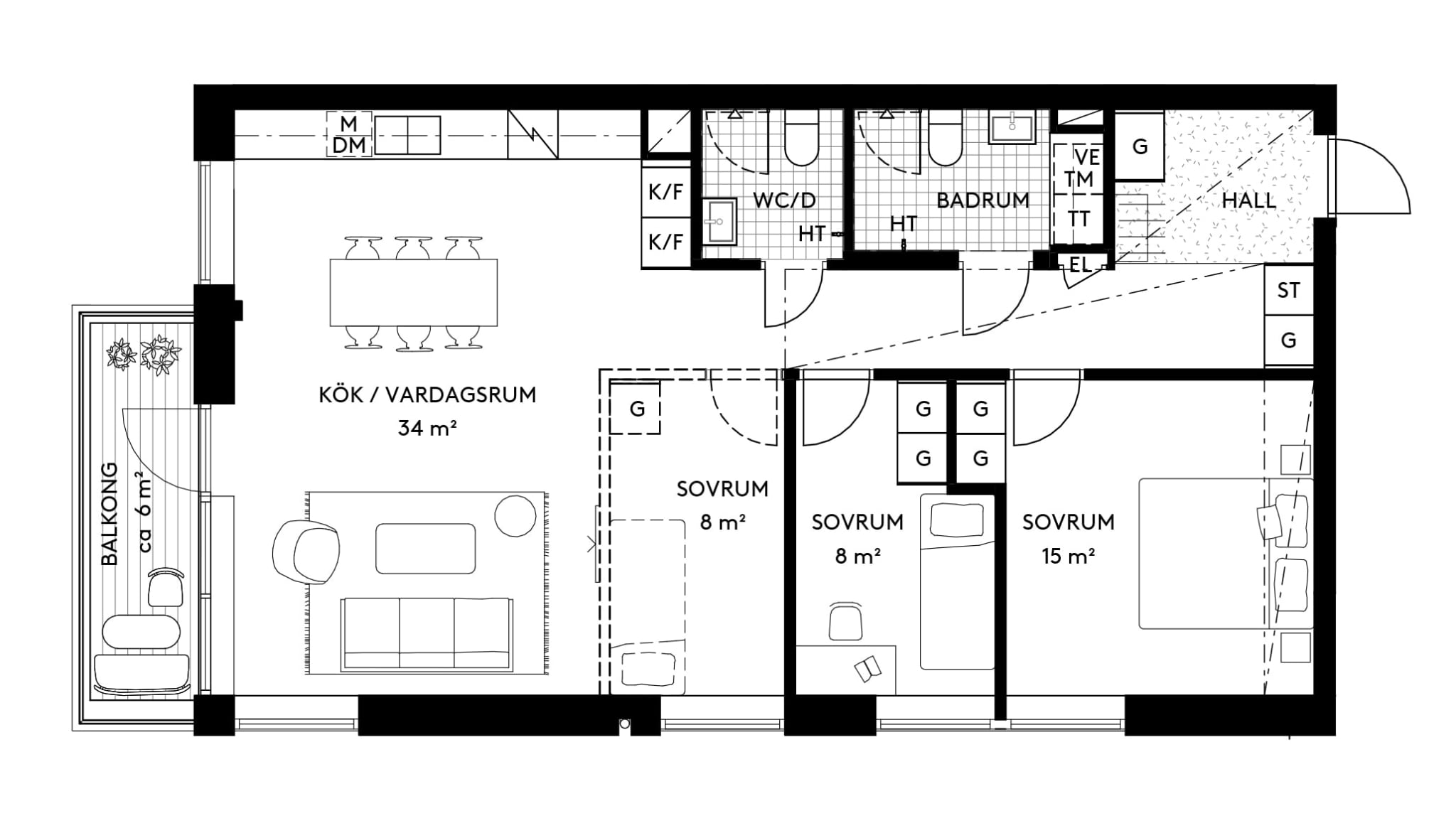 På 90 kvm ryms tre välplanerade sovrum ett med frånvalsvägg och två helkaklade badrum, varav ett med tvättmaskin och torktumlare. Det är generöst med förvaringsmöjligheter både i lägenheten och tack vare ett tillhörande förråd på källarplan.