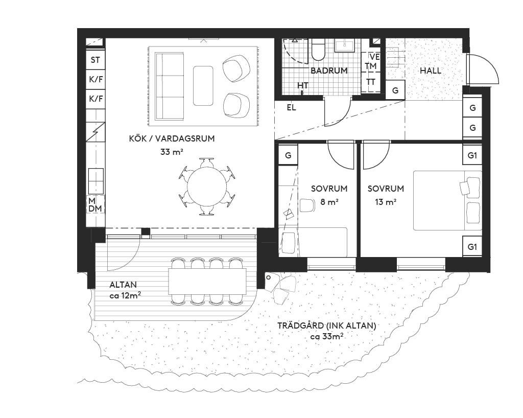 De 75 kvadratmeterna kännetecknas av hållbara och vackra materialval samt stora fönsterpartier. Här finns två välplanerade sovrum och ett helkaklat badrum med tvätt- och torkmöjligheter. Det fullutrustade köket går i en harmonisk linneton och ligger i öppen planlösning mot det luftiga vardagsrummet.