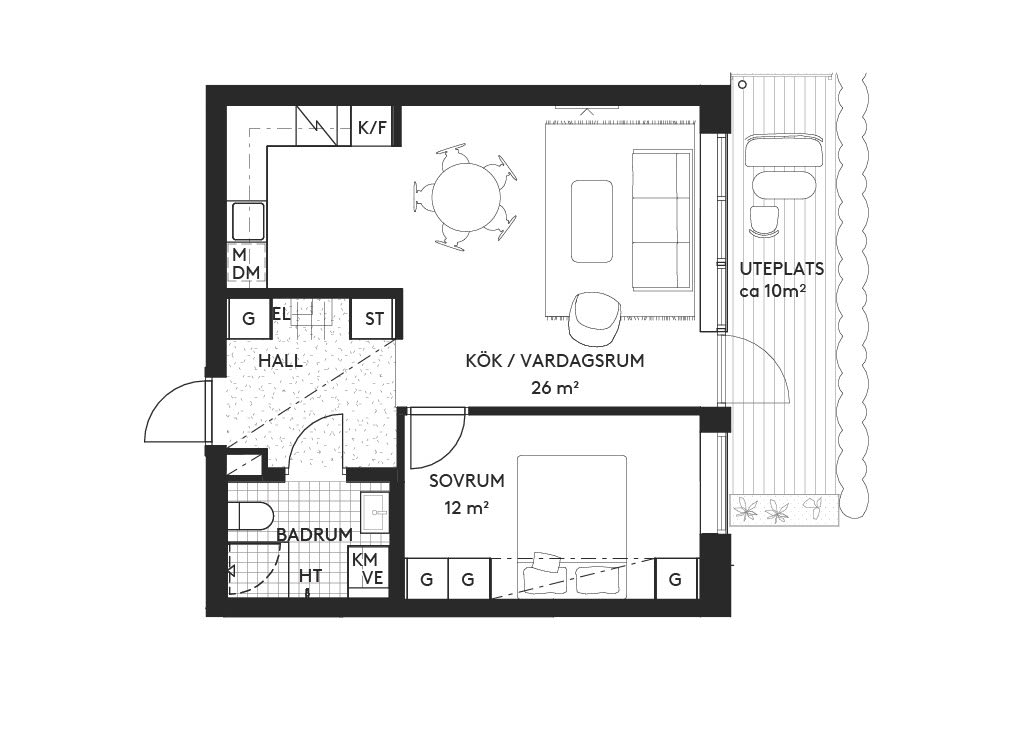 De 50 kvadratmeterna rymmer ett välplanerat sovrum och ett helkaklat badrum med tvätt- och torkmöjligheter. Det fullutrustade köket går i en harmonisk linneton och ligger i en smart och semiöppen alkovlösning mot vardagsrummet. Utanför dörren väntar skogens lugn eller stadens puls, beroende på vilket håll du går åt.