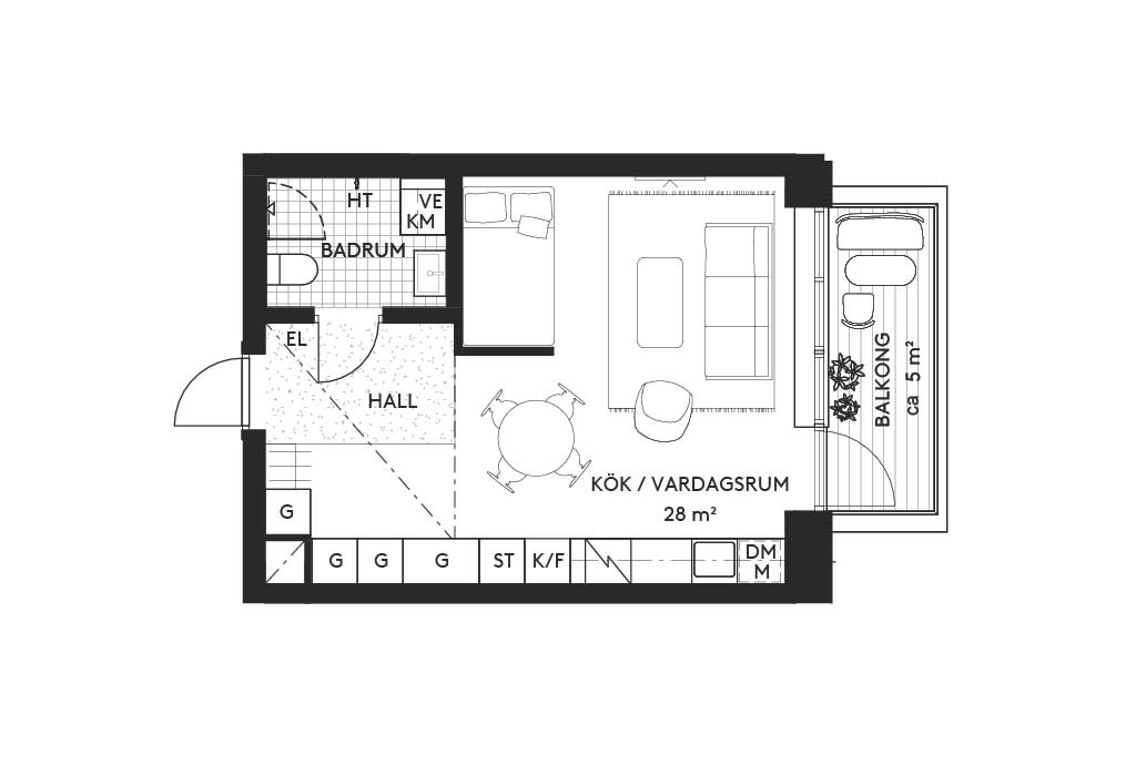 De 37 kvadratmeterna rymmer ett välplanerat allrum med stor fönstervägg, en praktisk sovalkov och ett helkaklat badrum med tvätt- och torkmöjligheter. Det fullutrustade köket går i en harmonisk linneton och ligger i öppen planlösning mot allrummet. Utanför dörren väntar skogens lugn eller stadens puls, beroende på vilket håll du går åt.