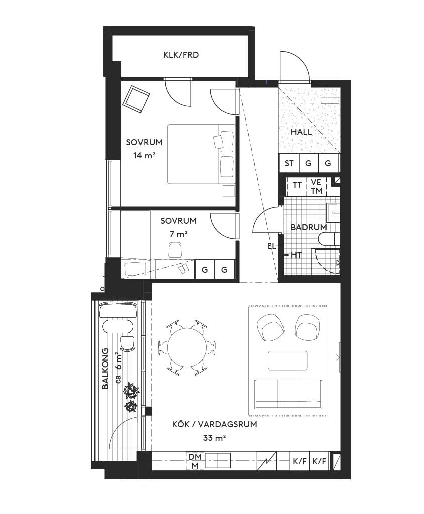 De 81 kvadratmeterna rymmer två välplanerade sovrum, ett med eget förråd eller walk-in-closet. Här finns också ett helkaklat badrum utrustat med tvättmaskin och torktumlare. Det fullutrustade köket ligger i öppen planlösning mot vardagsrummet och har en nästan heltäckande fönstervägg mot balkongen och gården.