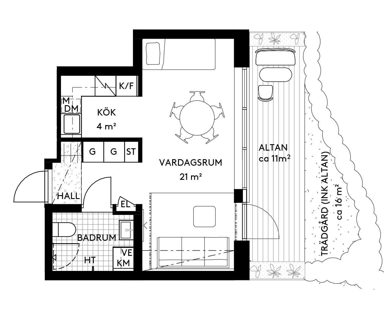 De 32 kvadratmeterna (48 kvm om man räknar med trädgården) rymmer ett välplanerat allrum med stora fönsterpartier, en kökshörna i linnetoner, en sovalkov och ett helkaklat badrum med tvätt- och torkmöjligheter. Utanför dörren väntar skogens lugn eller stadens puls, beroende på vilket håll du går åt.