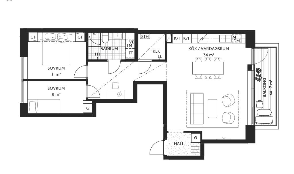 Lägenheten är inredd med högkvalitativa materialval och har två välplanerade sovrum i soligt sydvästläge. Det fullutrustade köket går i linnetoner och ligger i öppen planlösning mot vardagsrummet; härifrån når du dessutom en 7 kvm stor balkong som blickar ut över skogen. Utanför dörren väntar skogens lugn eller stadens puls, beroende på vilket håll ni går åt.