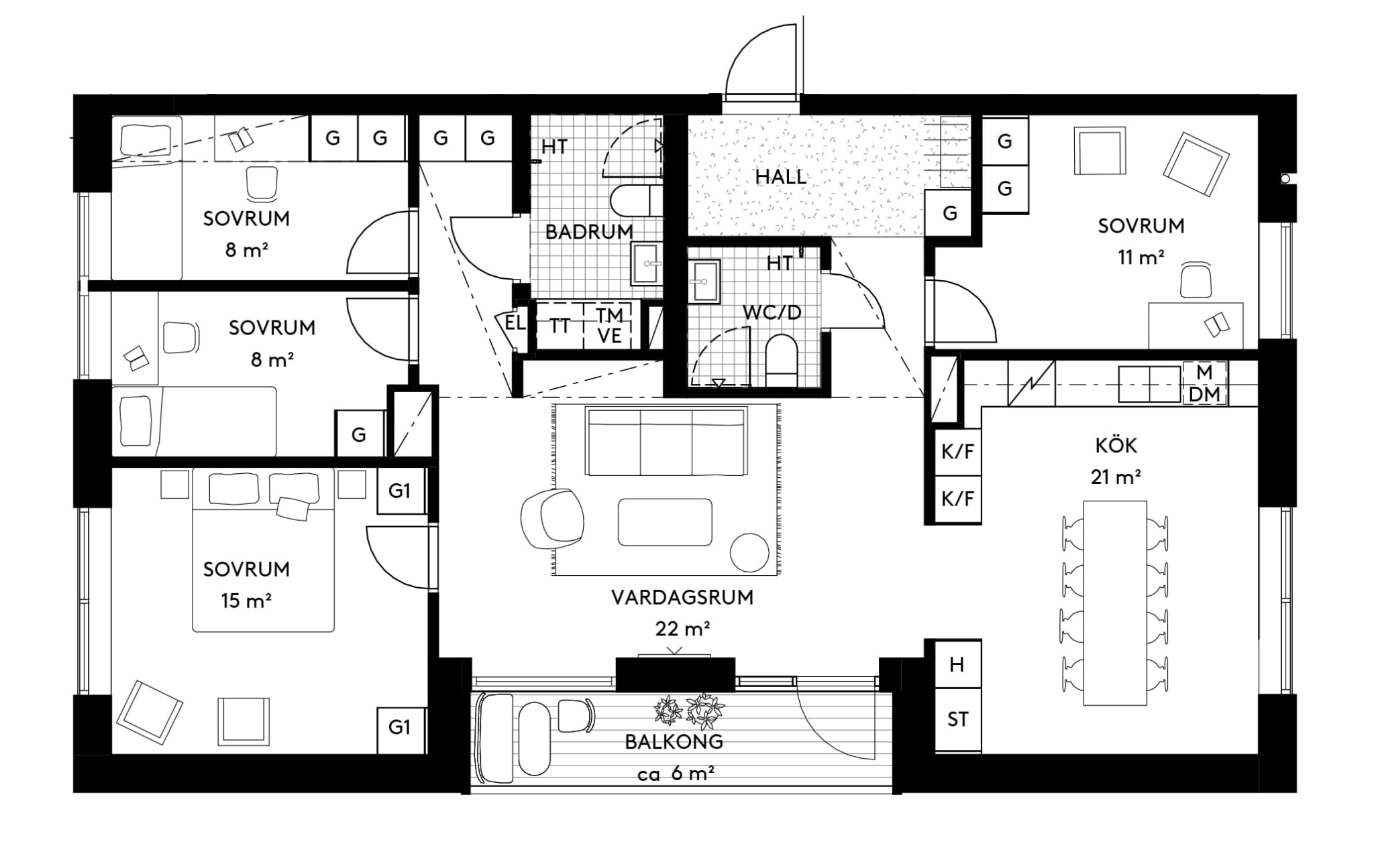 Lägenheten är inredd med högkvalitativa materialval och har fyra välplanerade sovrum. Här finns också två helkaklade badrum, varav ett med tvättmaskin och torktumlare. Det rymliga köket går i linnetoner och ligger precis invid vardagsrummet som öppnar upp mot en generös balkong i sydostläge. Utanför dörren väntar skogens lugn eller stadens puls, beroende på vilket håll du går åt.